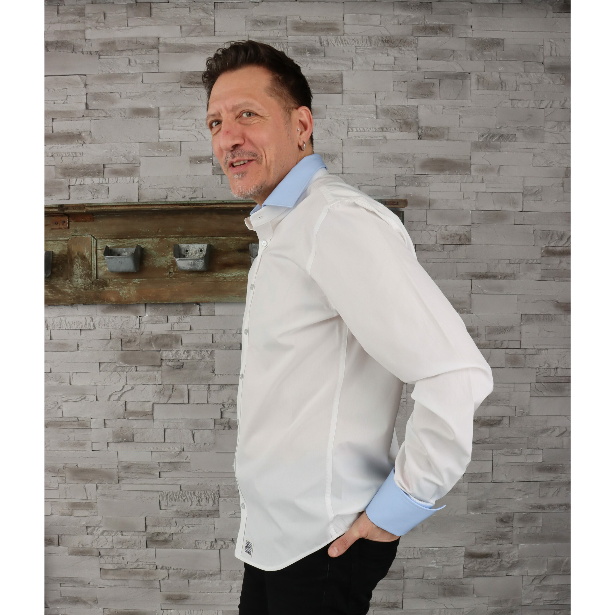 Ce pack prédéfini pour toi de cette chemise Homme Mao Blanche, son Col et ses Poignets Napolitain bleu clair, te permet de commander en quelques Clics.