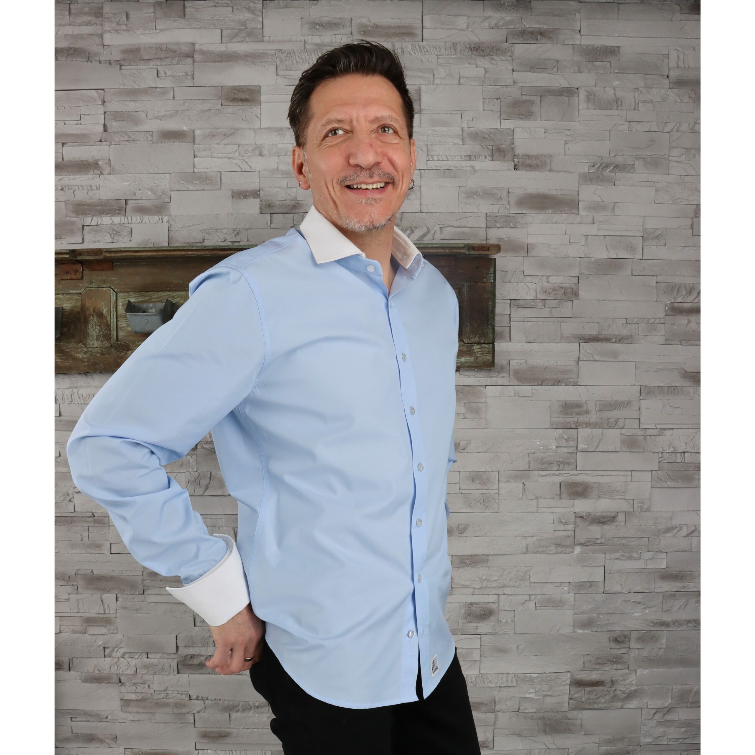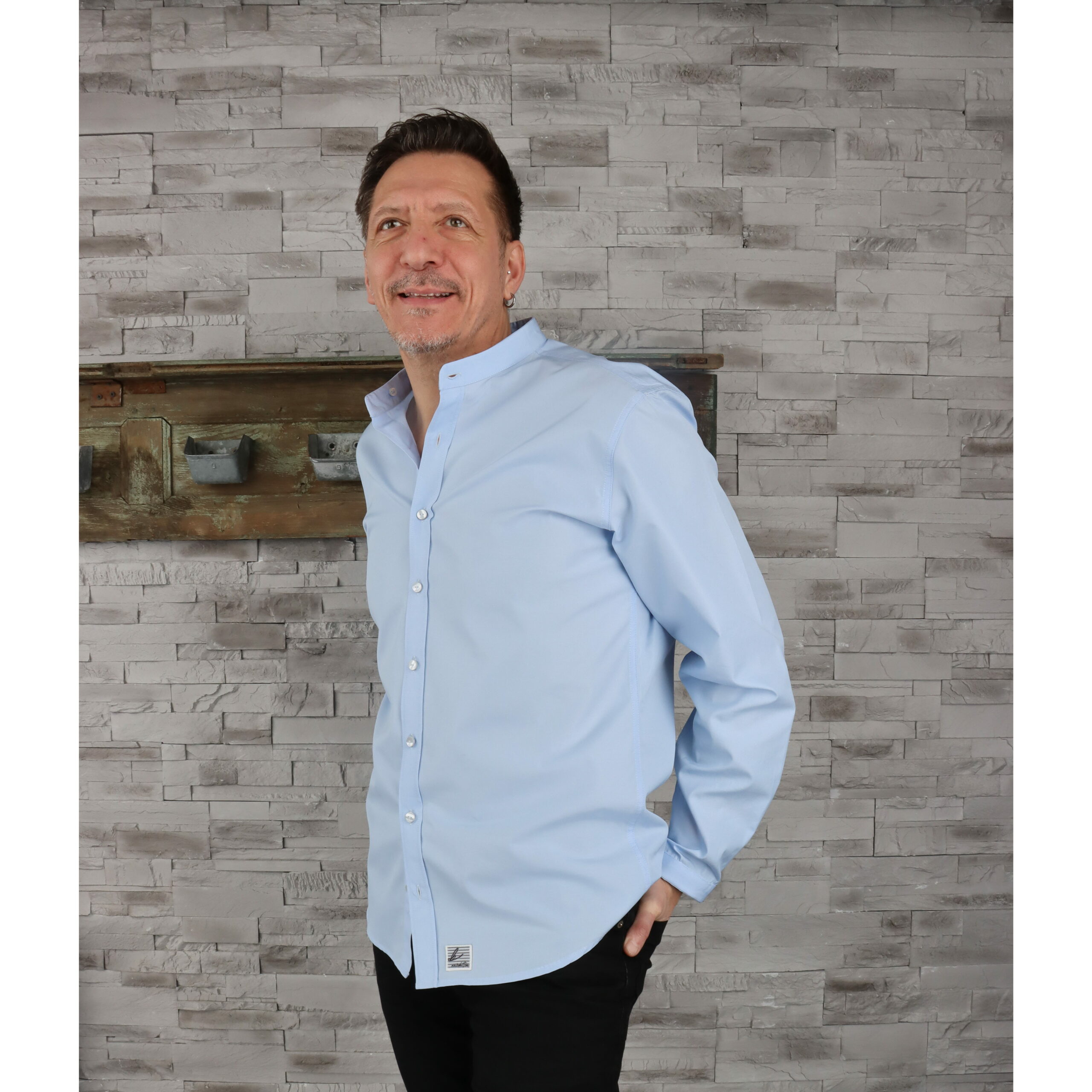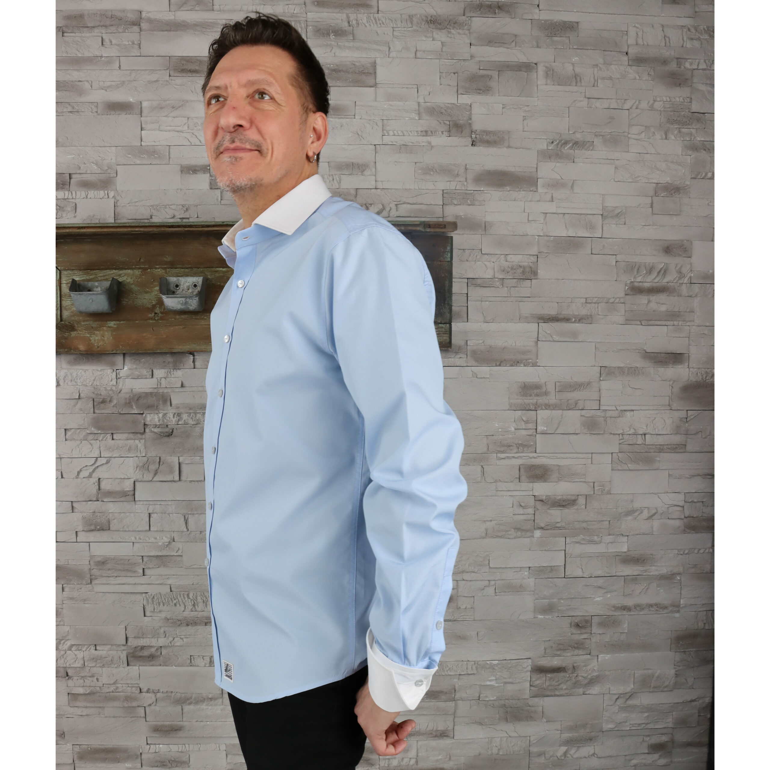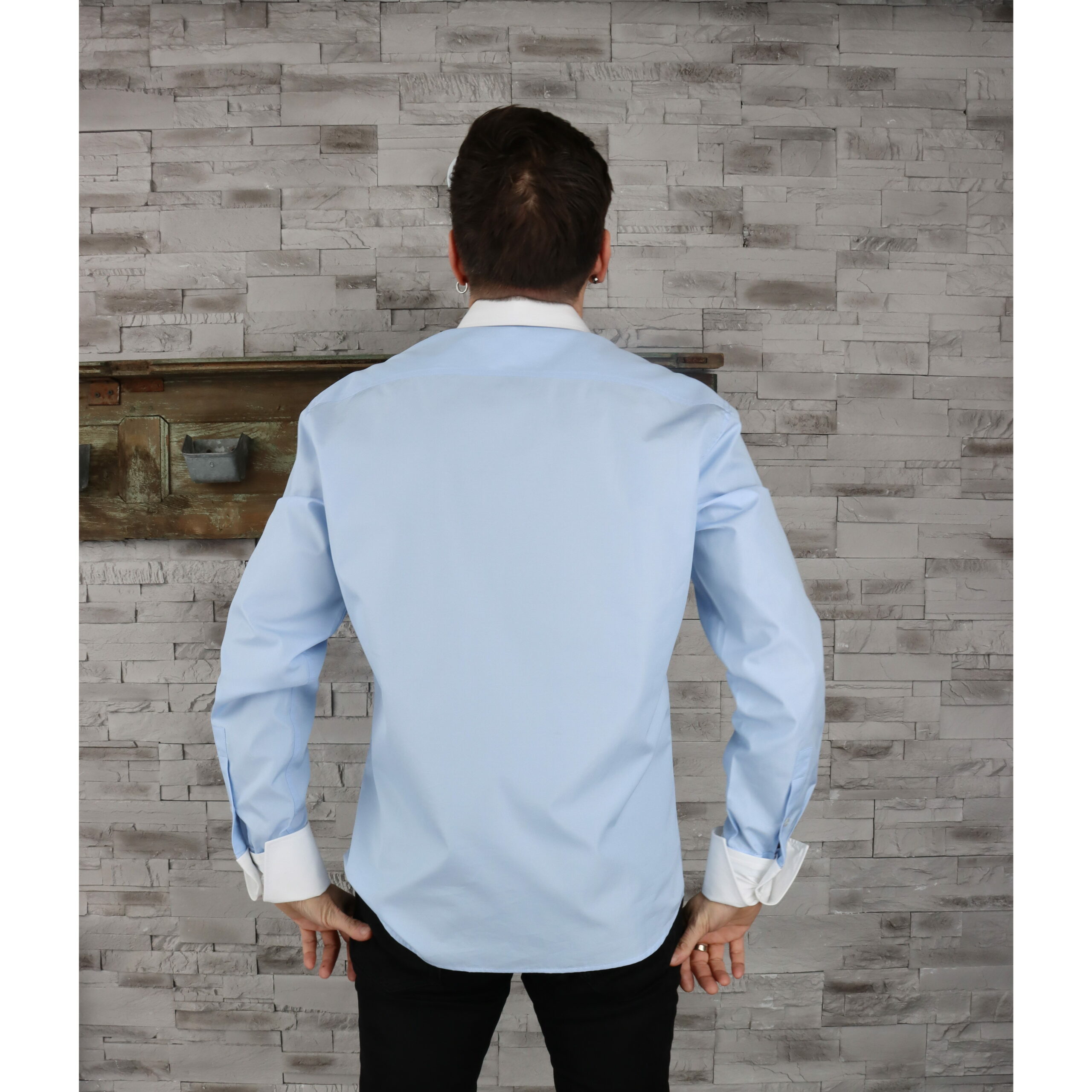 Ce pack prédéfini pour toi de cette chemise Homme Mao bleu clair, son Col & ses Poignets Napolitain, te permet de commander en quelques Clics.